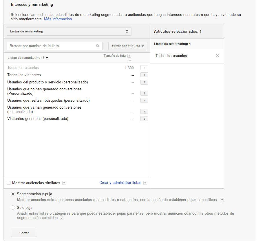 En la personalización de nuestra campaña debemos de tener en cuenta las audiencias, o grupos de usuarios que más nos interesan. Adwords crea varias audiencias por defecto, y también tenemos la opción para importarlas desde Analytics.