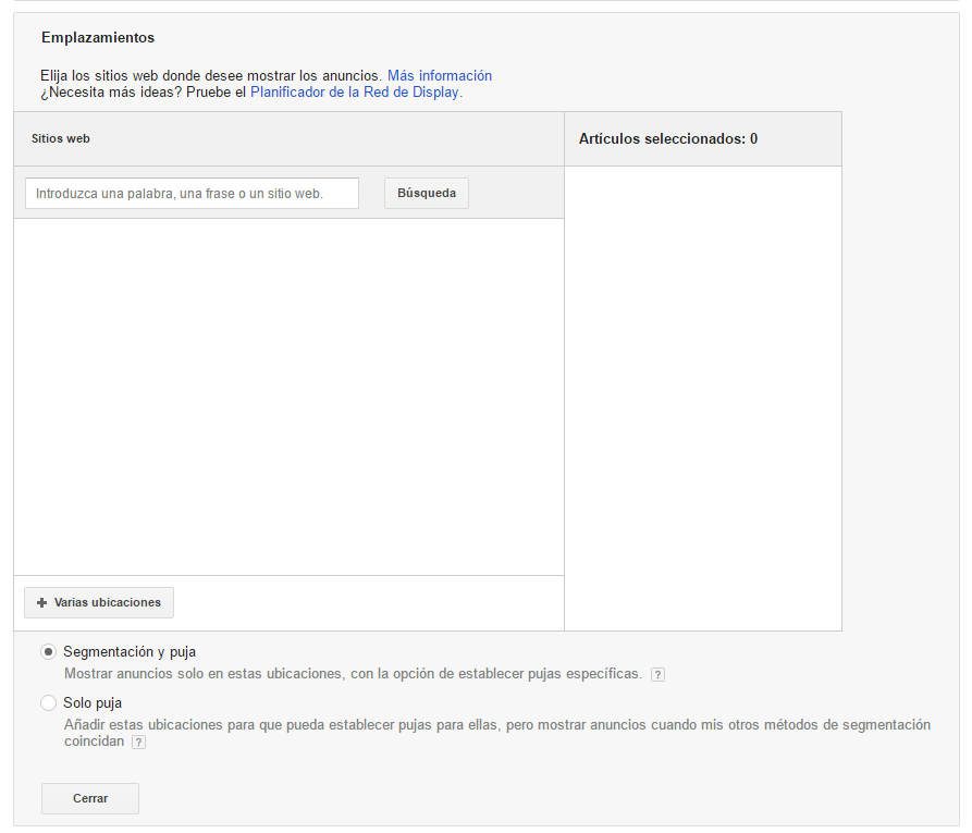 Además, si tenemos un interés especial en algún sitio web donde se pueda incluir nuestra publicidad de la campaña de display, podríamos especificárselo a Adwords. Esto se puede hacer desde la zona de personalización de nuestra campaña.