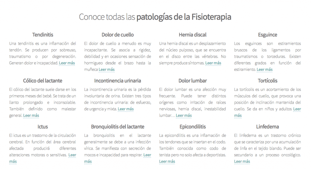 Y no solo eso, hemos dado un paso más: nuestra web está enfocada al paciente, y por ello tiene a su disposición toda la información de las lesiones o patologías más tratadas por el fisioterapeuta.