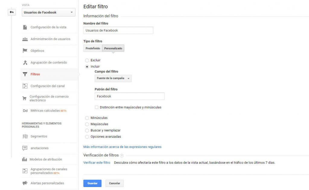 A partir de ahí tan sólo tenéis que seguir las instrucciones que aparecen más abajo para crear el filtro que aísle en esa nueva vista a los visitantes que llegan desde Facebook.