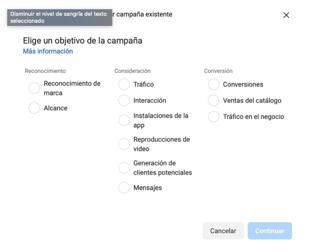 - Define el objetivo. Para este caso, lo que aconsejo es marcar la opción de MENSAJES o CONVERSIONES. Haremos el ejemplo con la primera.