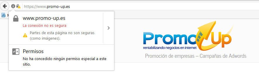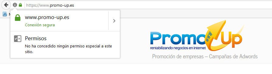 Para escribir esta página y explicar todo el proceso de una manera gráfica, resultaba necesario recurrir a la instalación de un certificado, así que para confirmar que los beneficios no son una simple pose, o parte de una moda pasajera, lo he instalado en mi propio sitio web: www.promo-up.es que como veréis, si entráis ahora, ofrece un precioso icono de un candado en la zona alta del navegador, informando sobre una conexión segura.